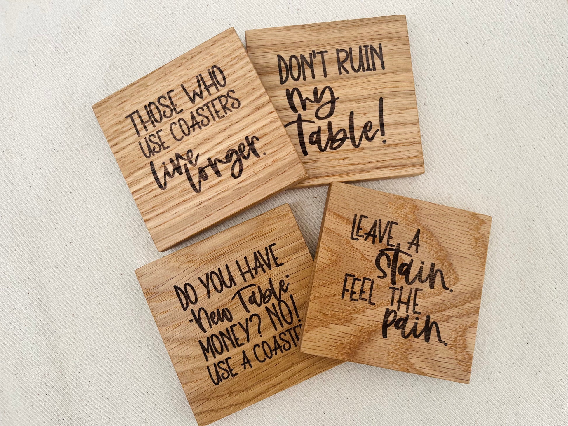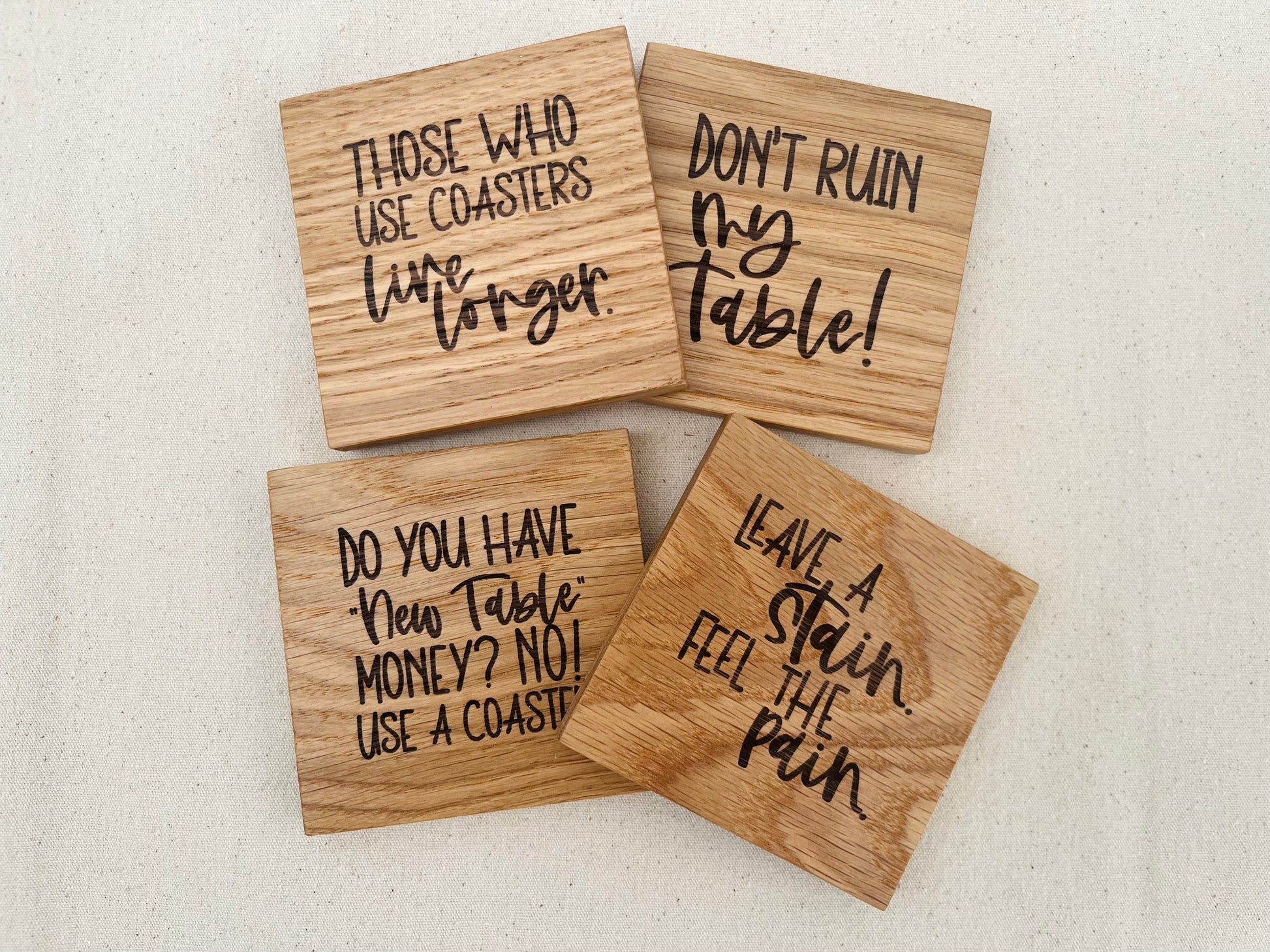 Grab your Don’t Ruin My Table Engraved Oak Coaster Set today and keep your surfaces safe while making a statement!