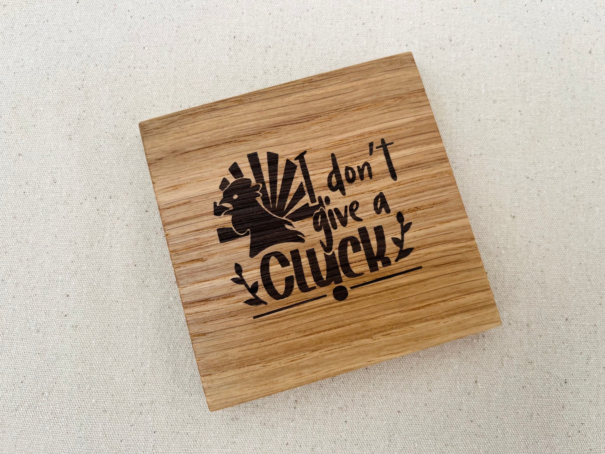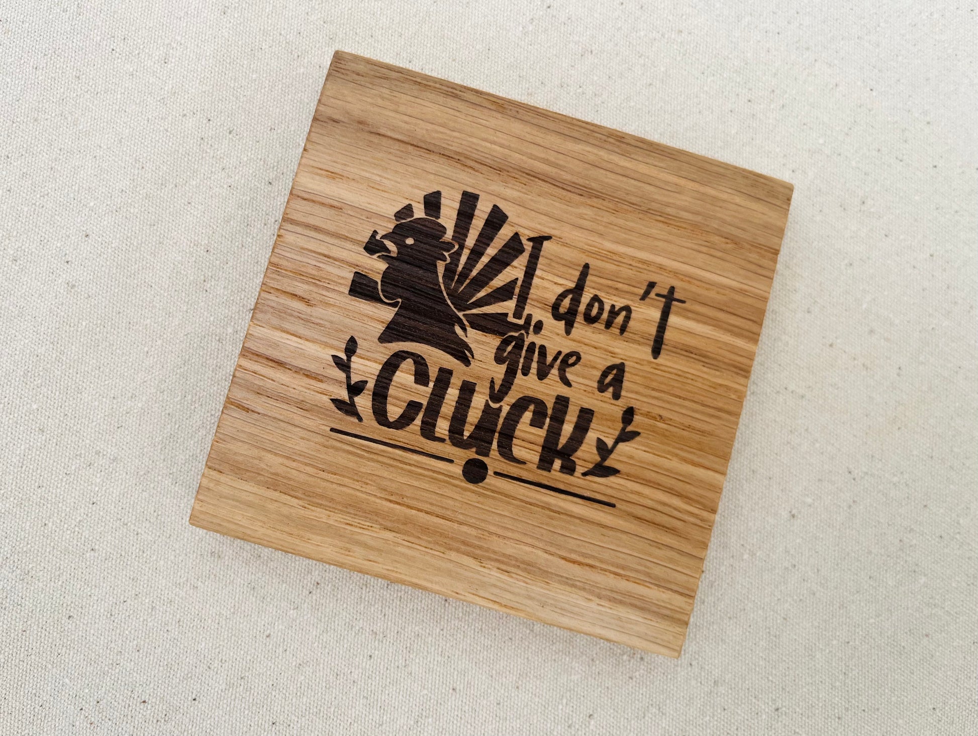 Introducing the I Don't Give a Cluck Engraved Coaster, the perfect blend of style and personality for your home. Made from solid oak, this coaster not only protects your surfaces but also makes a statement.