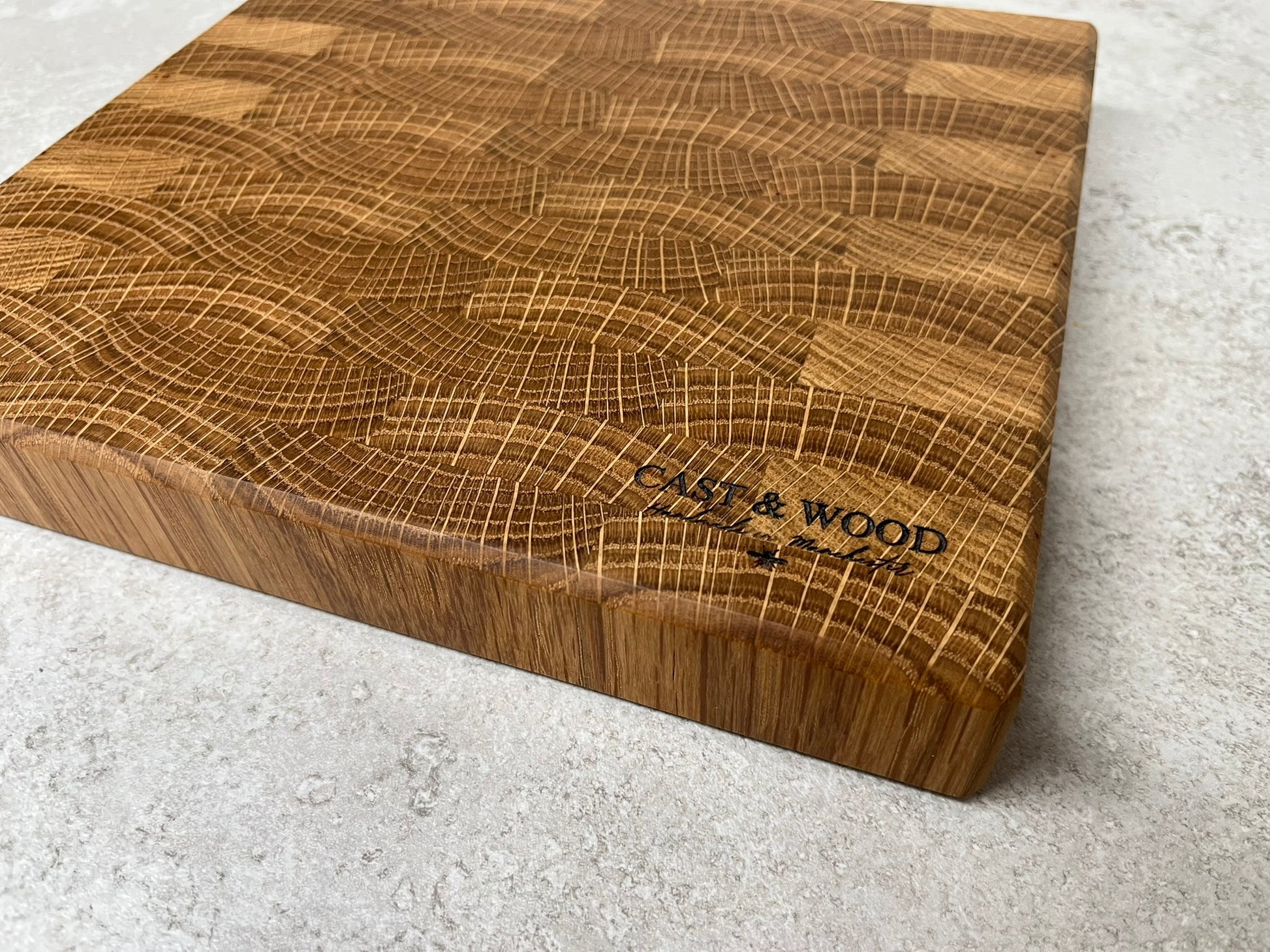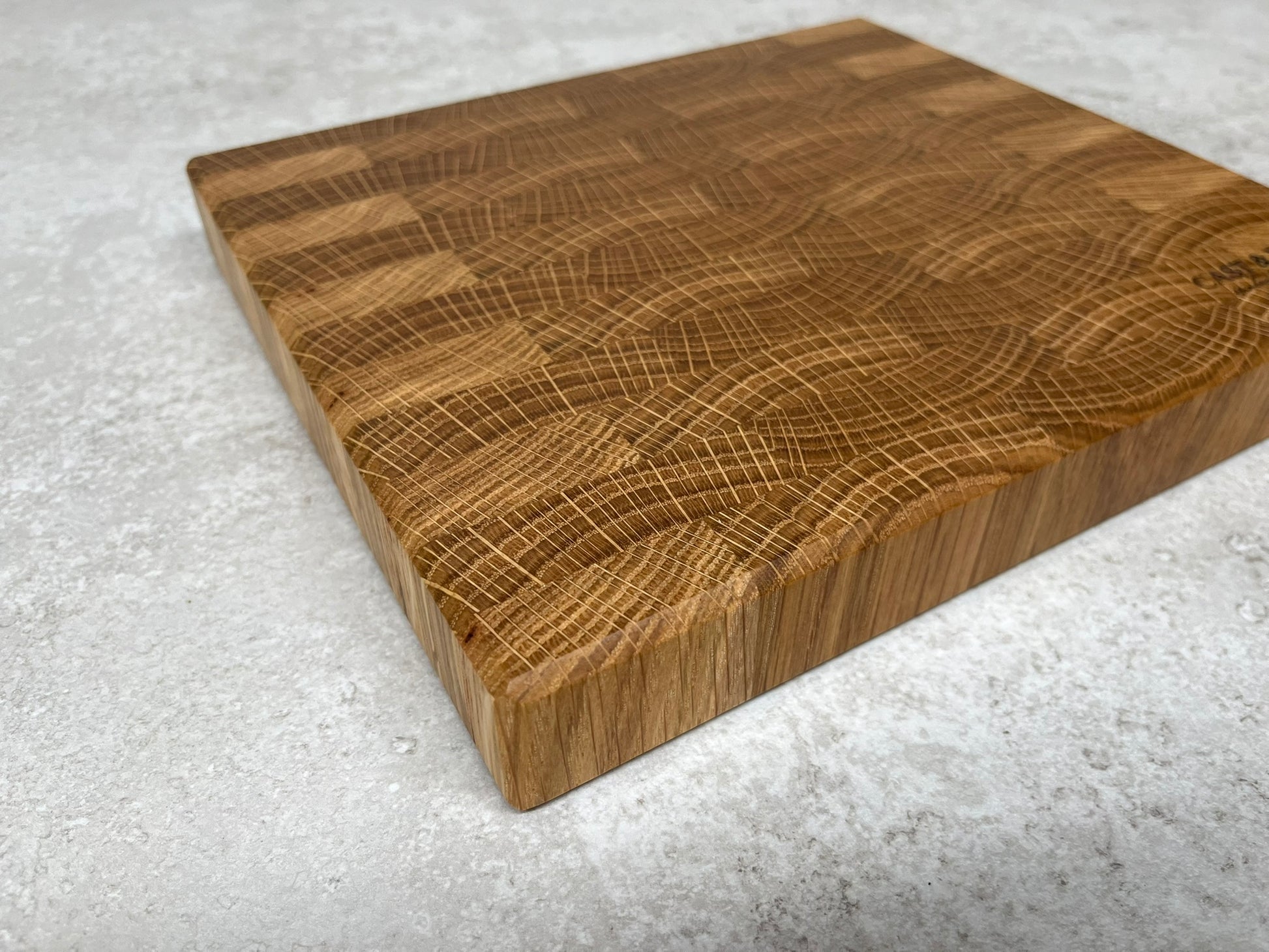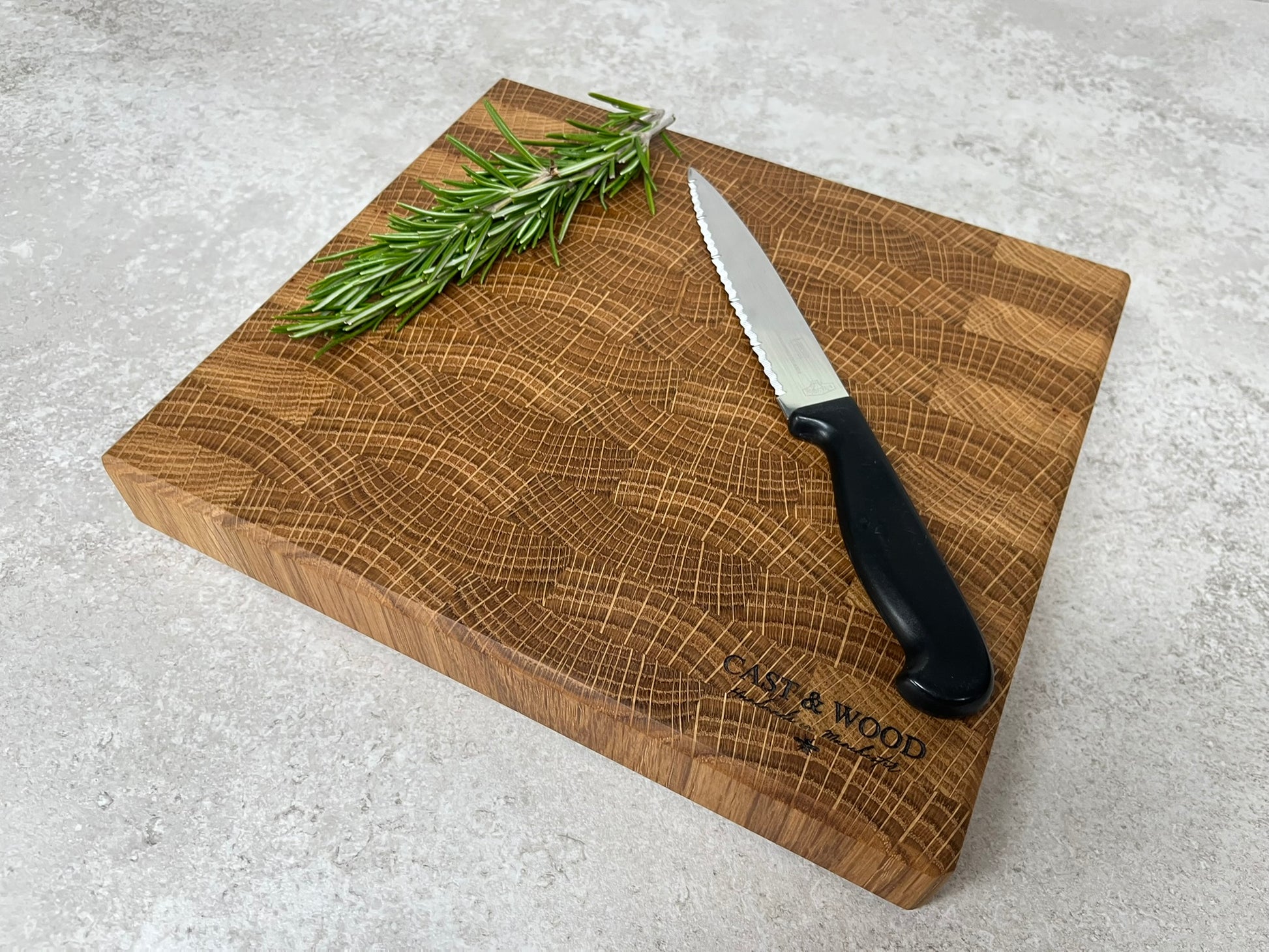 Made from solid oak, this board is designed to withstand the rigours of daily use while adding a touch of elegance to your kitchen. Its durable construction means you won't have to replace it anytime soon – it’s built to last. The unique end grain design is a standout feature, specifically crafted to keep your knives sharper for longer. This means less time spent worrying about dull blades, freeing you up to enjoy the art of cooking without interruption.