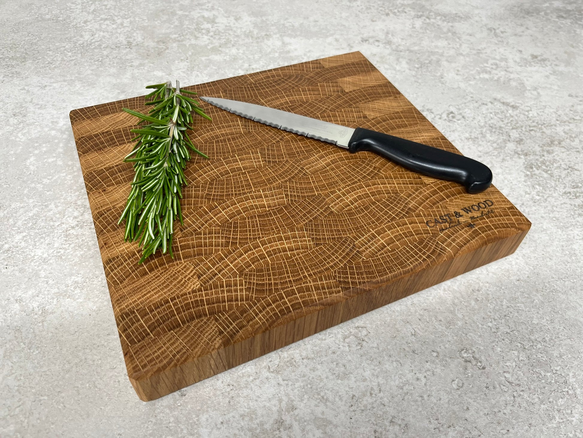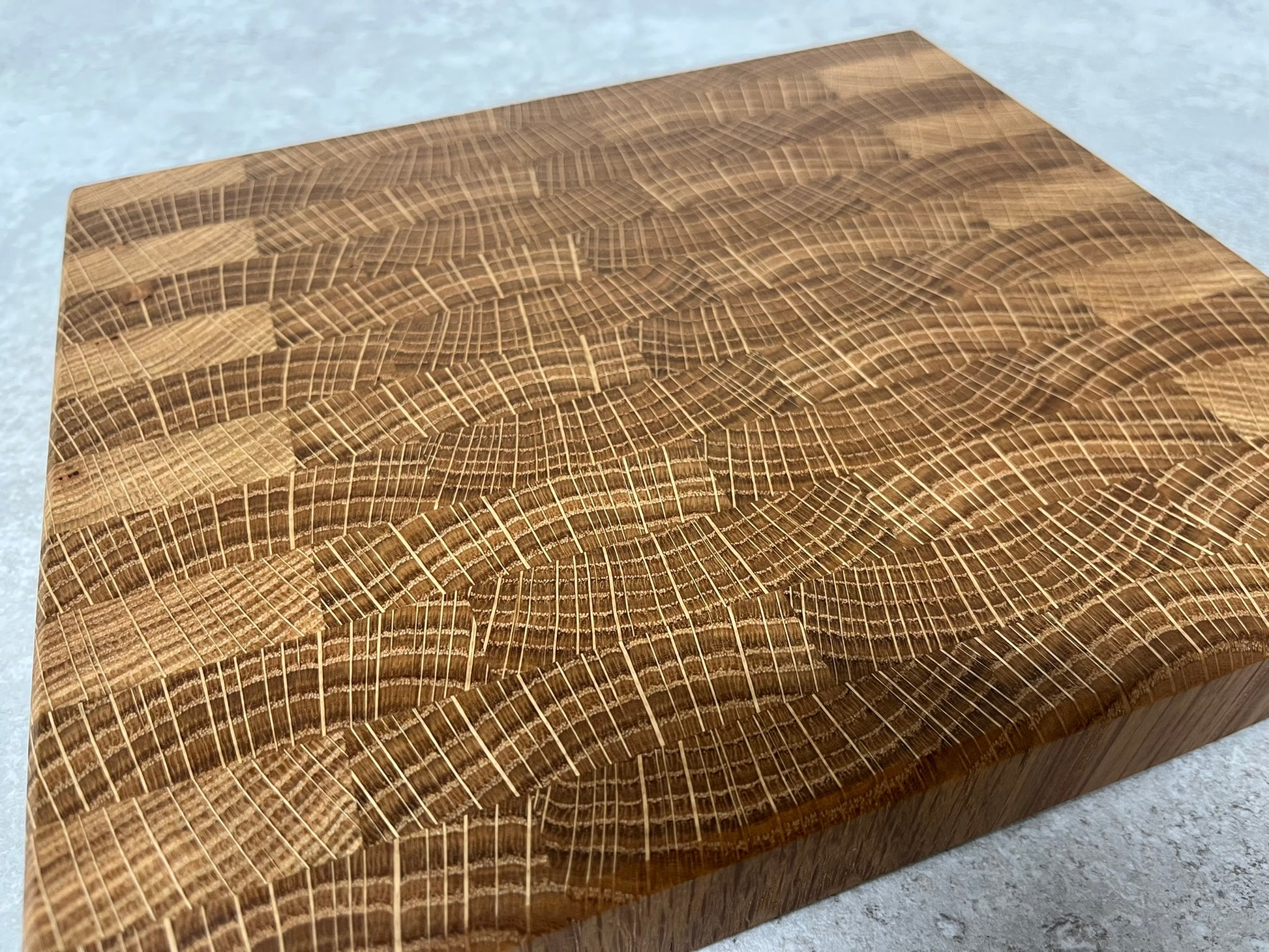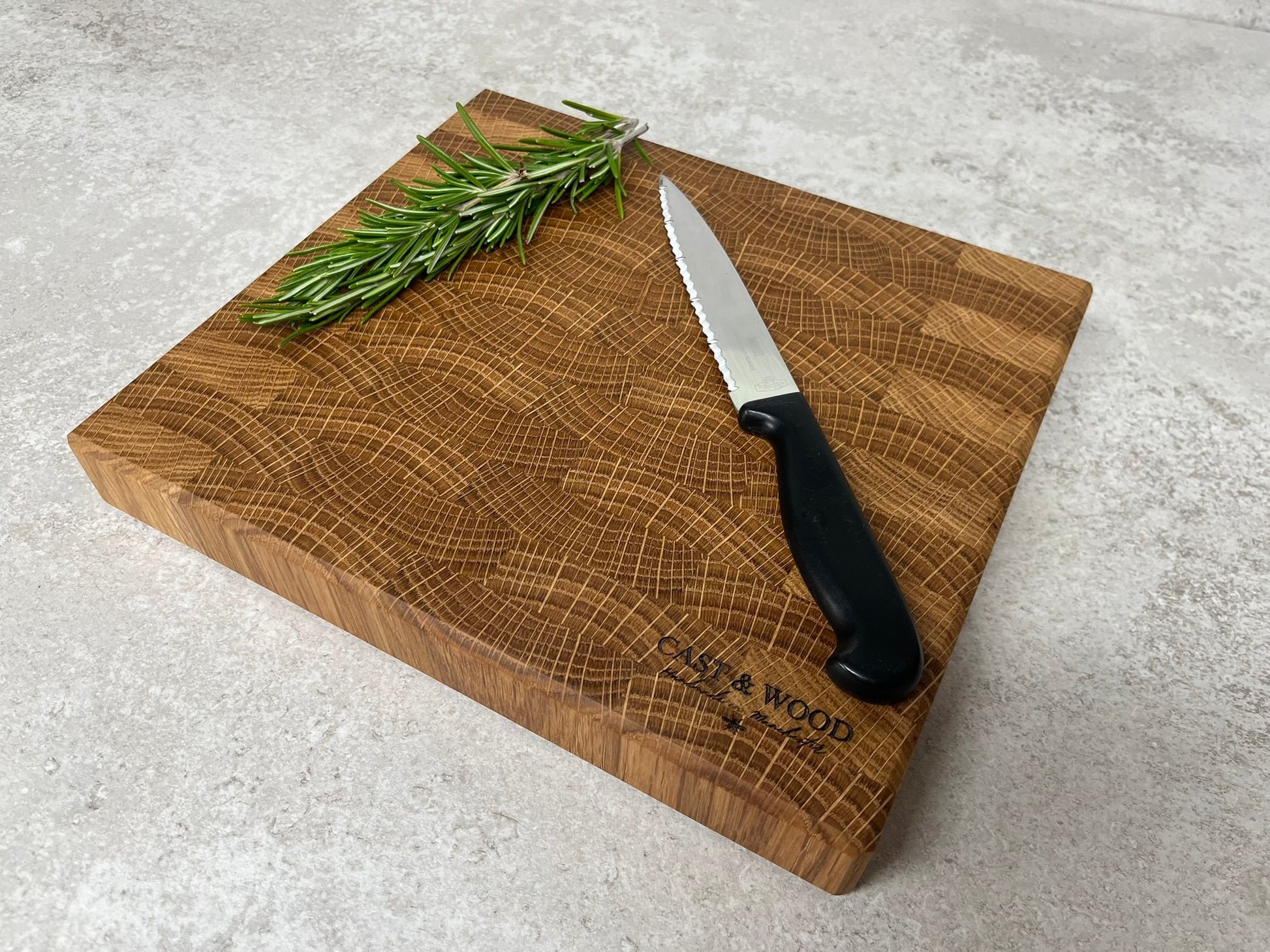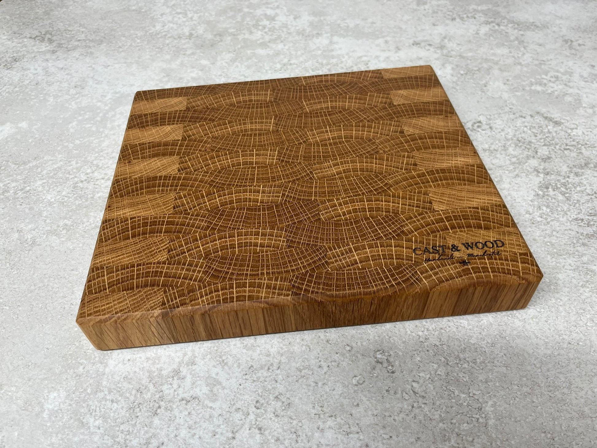 Made from solid oak, this board is designed to withstand the rigours of daily use while adding a touch of elegance to your kitchen. Its durable construction means you won't have to replace it anytime soon – it’s built to last. The unique end grain design is a standout feature, specifically crafted to keep your knives sharper for longer. This means less time spent worrying about dull blades, freeing you up to enjoy the art of cooking without interruption.
